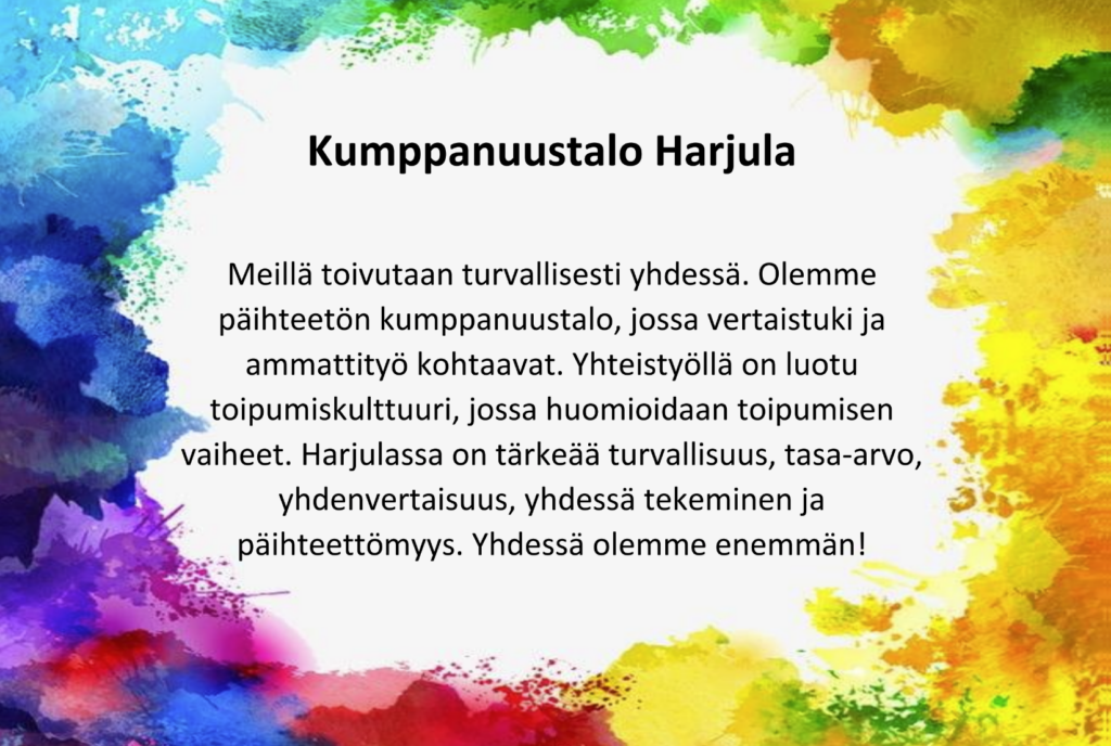 Kumppanuustalo Harjulassa uskomme, että paras tuki päihderiippuvuudesta toipumiselle syntyy yhdessä tekemällä. Tämä sivu kertoo niistä hetkistä, tunnustuksista ja kumppanuudesta, jotka ovat tehneet meistä sen, mitä olemme tänään. Vuodesta 2004 alkaen olemme rakentaneet toimintamallin, joka yhdistää toipujat, vertaistoimijat ja ammattipäihdetyöntekijät vahvaksi yhteisöksi ja saa aikaan vaikuttavaa päihdetyötä.