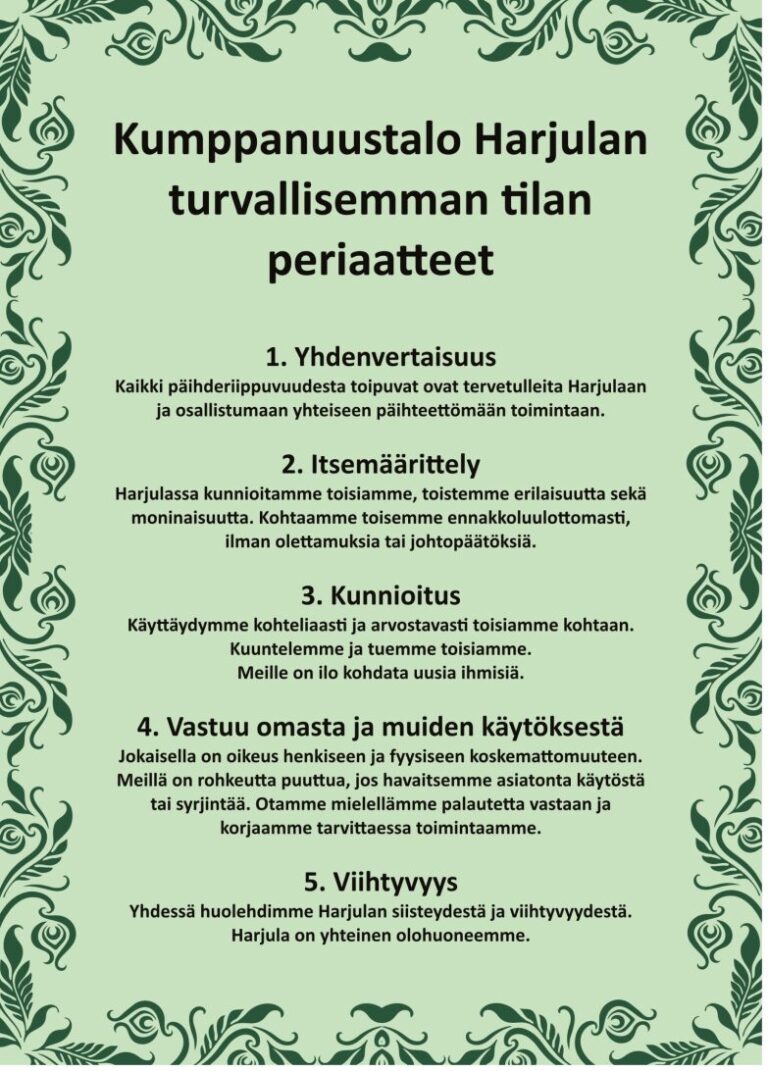 Kumppanuustalo Harjulan yhteisö on suunnitellut yhdessä turvallisemman tilan periaatteet, joihin sitoudumme kaikessa toiminnassamme.